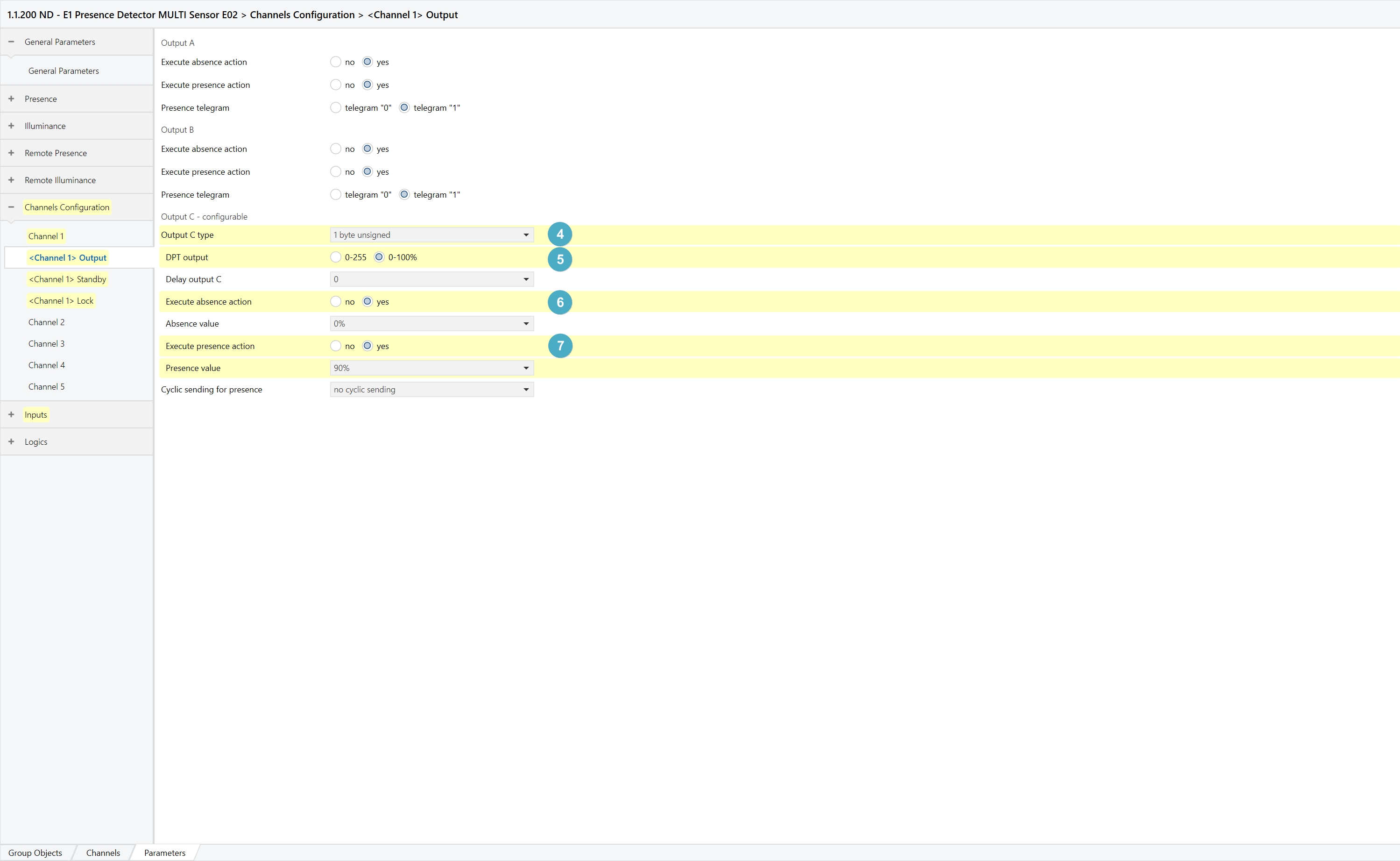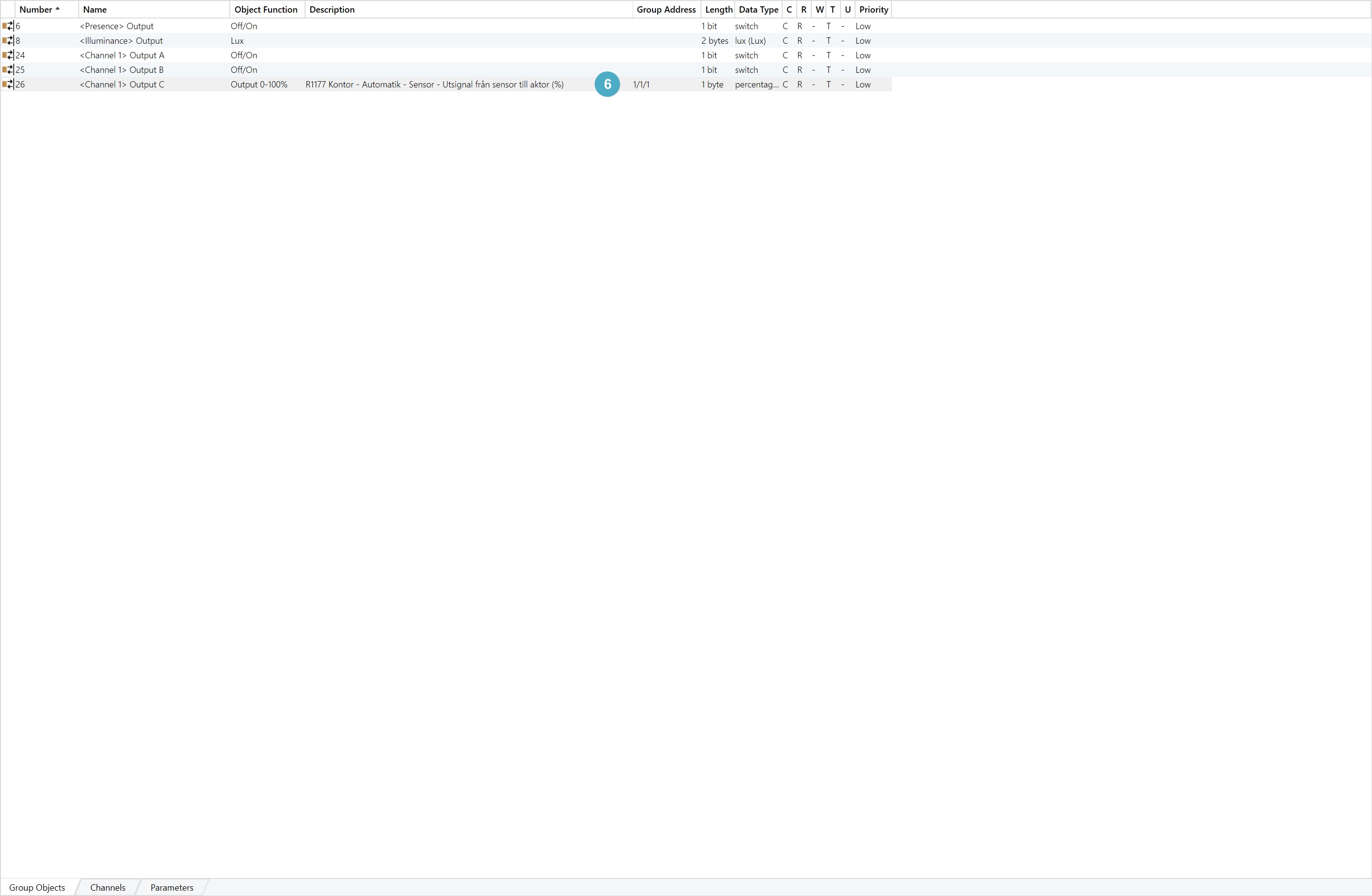 - Skapa gruppadress, knyt från sensorns Output C till aktor (1 byte, %).