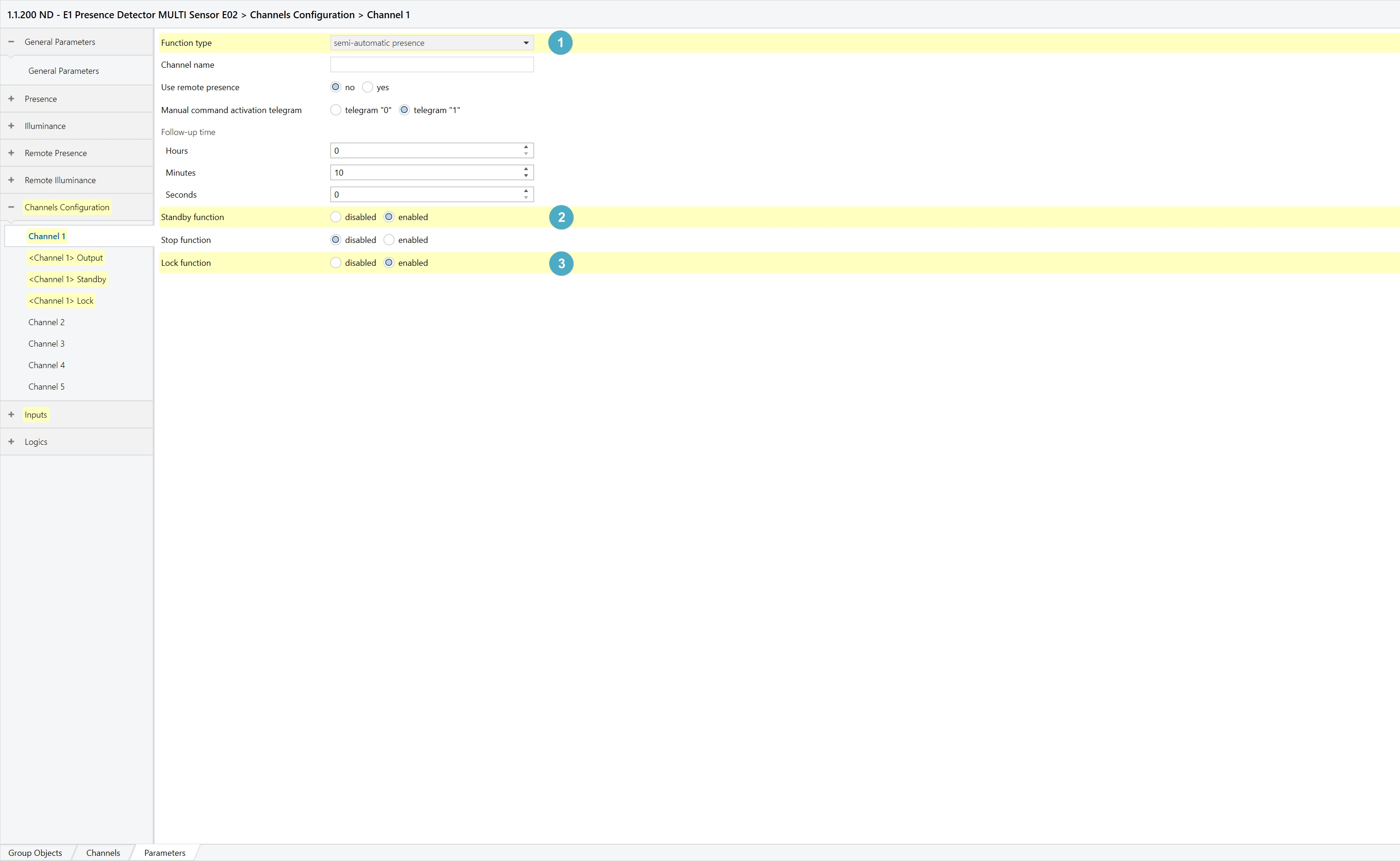 - Välj konfigurationen kanalen ska använda, på "function type:" välj "semi-automatic presence".