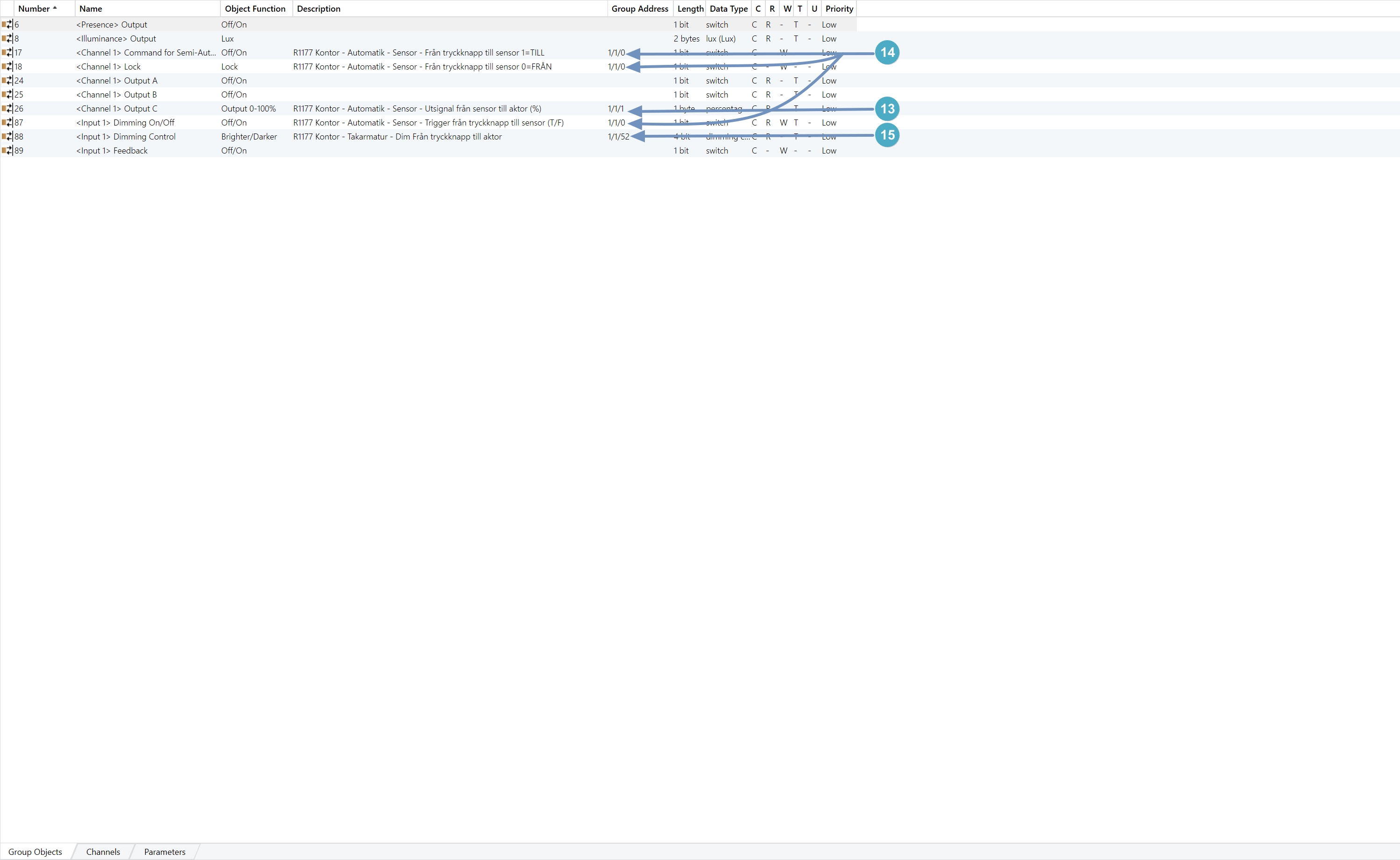 - Knyt samma gruppadress från tryckknapp till sensor på objekt 17 (command for semi-automatic) och 18 (Lock)