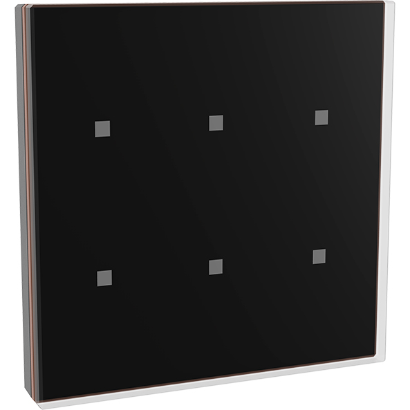 Dinuy PU-KNT-106 är en exklusiv kapacitiv KNX-tryckknapp med svart glasskiva, ram i kopparfinish och tunn design på endast 12 mm. Den har 6 beröringsytor med belysta ikoner (ej anpassningsbara) och ger smidig styrning av belysning, solskydd och scener.